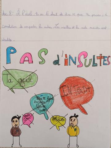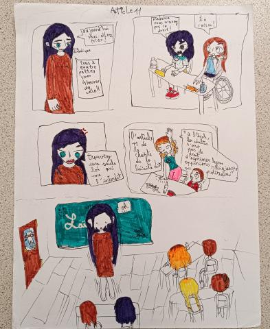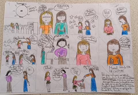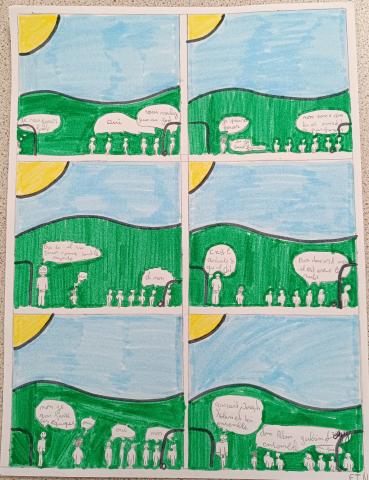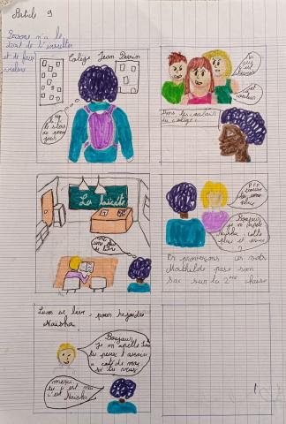 Pour finir, ils ont dû créer une bande dessinée format A 4 pour illustrer un des articles de la charte. C'est une façon différente de travailler et d'évaluer ce qui a été compris. Les compétences vérifiées étaient d'abord "connaître les principes et les valeurs de la République", ensuite la compétence "s'impliquer" dans son travail.
