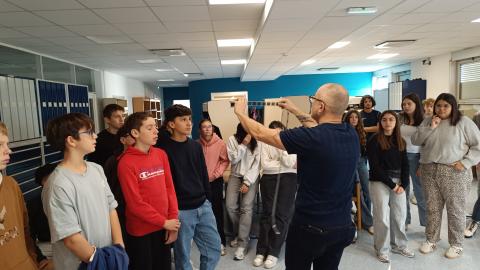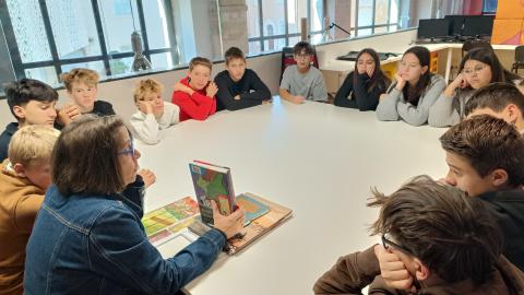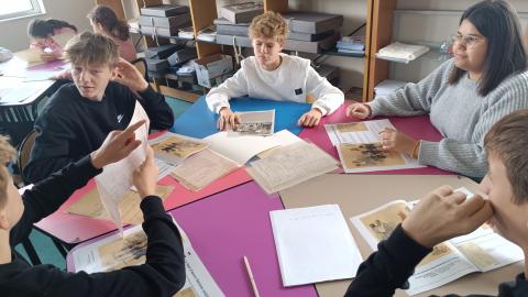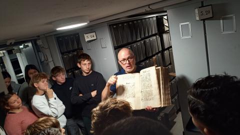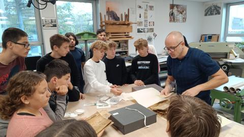 Aux archives, dans un premier temps, Vivien Eynard a expliqué aux élèves la "règle des 4 C" du service public des archives : collecter, classer, conserver et communiquer. Pourquoi faut-il conserver certains documents ? Comment les choisir ? Comment les protéger ? Comment les restaurer ? etc