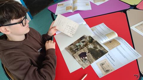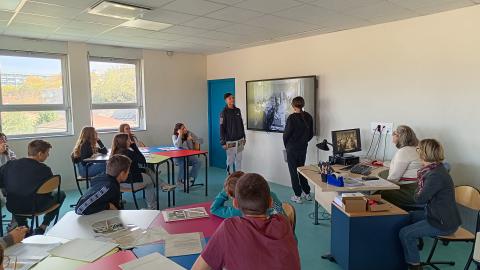 Dans un deuxième temps, avec Lucie Dunas-Olivier-Drure, les élèves ont travaillé en groupes sur des archives de l'époque de la Première Guerre mondiale dans la Drôme, avec des thèmes variés comme le rôle des femmes, le rôle des enfants, le travail des ouvriers venus des colonies, les procédures à respecter pour enterrer un soldat décédé ... Chaque groupe a ensuite désigné un ou deux porte-paroles pour expliquer aux autres ce qu'il a compris sur la guerre grâce à son dossier documentaire. Une belle occasion de s'entraîner pour l'oral du brevet.